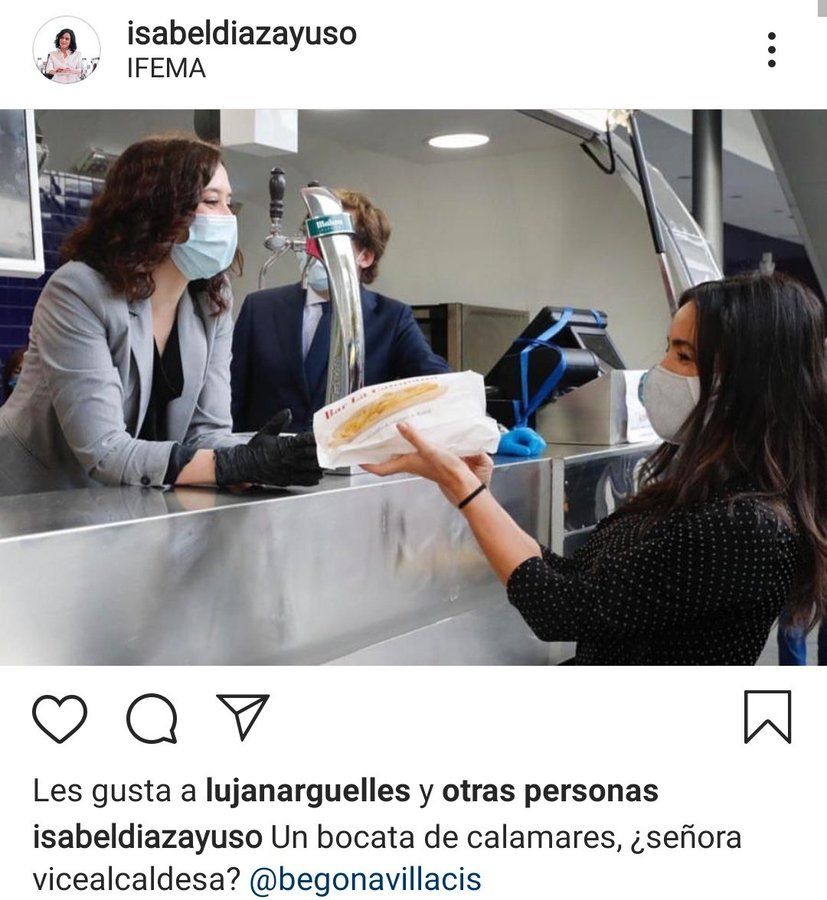 Y allí, Isabel Díaz Ayuso, presidenta de la Comunidad, ha dado imágenes que han dado que hablar. Muchos selfies, comentarios en redes sociales y hasta una foto subida por ella misma a sus redes en la que se la ve repartiendo bocadillos. Lo hace a la vicealcaldesa de Cs, Begoña Villacís, y junto al alcalde, José Luis Martínez Almeida.