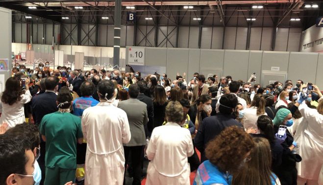 El acto estaba concebido como la salida del último paciente del hospital de campaña montado en el palacio de ferias. Con capacidad de 5.000 camas, fue fundamental para aguantar la pandemia de coronavirus hace unas semanas. Se montó en cuatro días, literalmente. Ahora, es el símbolo de que lo peor, al menos por el momento, ha pasado en Madrid, el lugar más maltratado por la enfermedad.