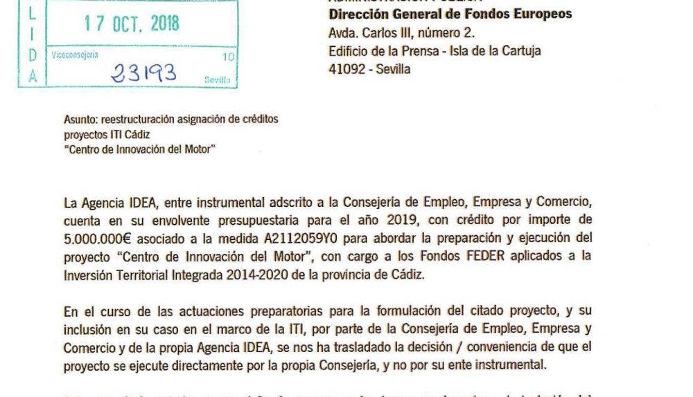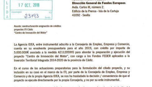 El gobierno local del Ayuntamiento de Jerez ha indicado que el 17 de octubre de 2018, "la Junta de Andalucía del anterior Gobierno de Susana Díaz sigue con el procedimiento del proyecto, prueba de ello es que la Consejería de Presidencia comunica en esa fecha que de conformidad con lo dispuesto de su decreto de Gobernanza se le traslada que el crédito de cinco millones que se prevé asignar al citado proyecto se incluya en la envolvente presupuestaria de la Consejería de Empleo, Empresa y Comercio".