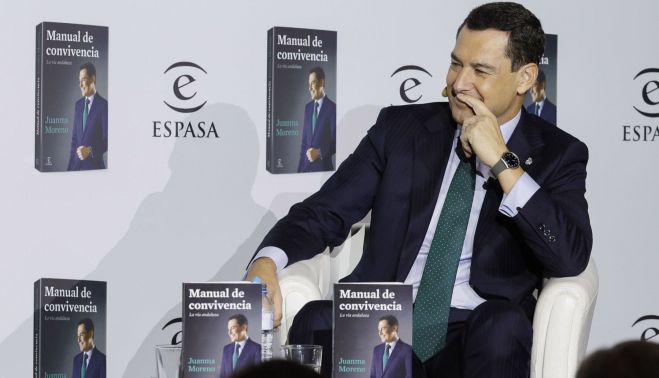 El presidente de la Junta de Andalucía, Juanma Moreno, ha presentado este lunes en Sevilla su primer libro, Manual de convivencia. La vía andaluza (Espasa), un volumen de 165 páginas y 32 capítulos que, según el propio Moreno, resume su manera de entender la política. Durante el acto, Moreno se mostró crítico con la situación política actual y aseguró sentirse "incómodo" con la demagogia, con la mentira y con la bronca, motivos por los que, afirmó, también se siente "incómodo" con el actual PSOE, que se ha convertido "en sanchismo puro".