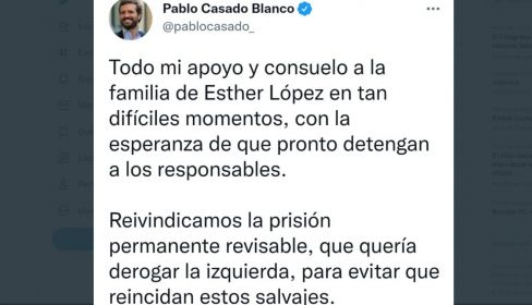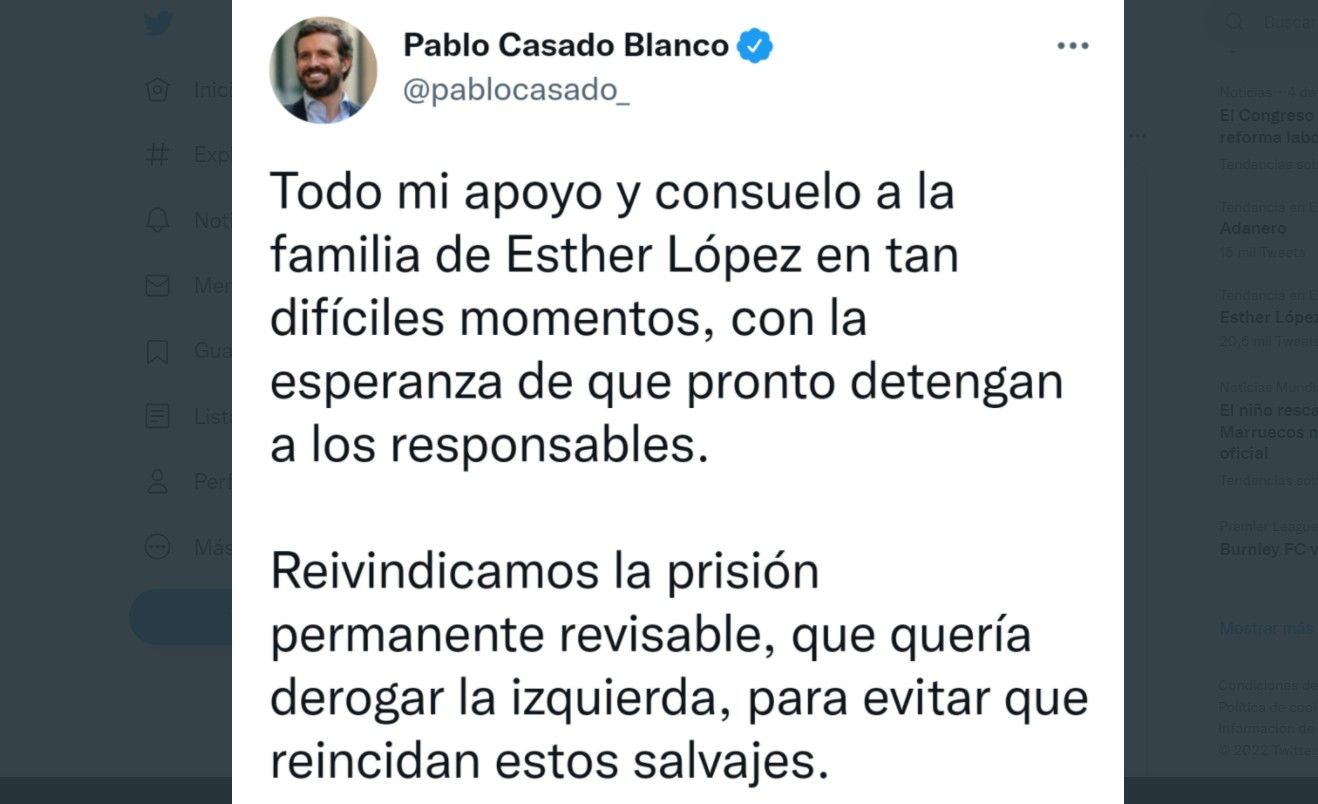El presidente del Partido Popular, Pablo Casado, ha querido mostrar su consuelo en las redes sociales a la familia de Esther López, la joven de 35 años que llevaba desaparecida desde el día 12 de enero y cuyo cadáver se encontró este sábado. Sin embargo, la oportunidad no ha podido ser más desafortunada.