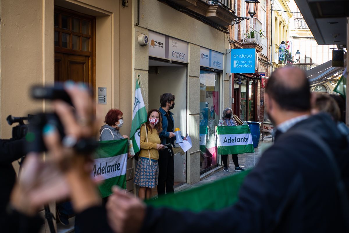 A su lado, el parlamentario andaluz Ricardo Sánchez, y los diputados provinciales de Adelante Cádiz, Lorena Garrón y Alejandro Gutiérrez, se suman a la acción mientras el resto del grupo sujeta banderas para la ocasión. “Energía para todas, limpia y pública” versan las pancartas que agitan al unísono. Uno de ellos da un salto y estampa una pegatina reivindicativa en el letrero de la sede de Endesa. La movilización continúa de forma pacífica al mismo tiempo que, desde el interior, algunos clientes miran a la concentración a través del escaparate.