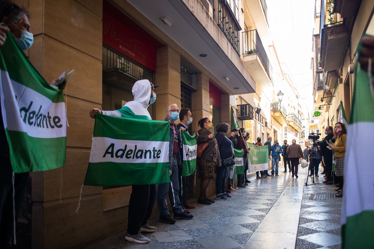 La voz de la parlamentaria andaluza de Adelante Andalucía, Ángela Aguilera, se alza en una mañana gélida para informar a la ciudadanía de la movilización y denunciar el enriquecimiento de las eléctricas. “Un sector estratégico como la electricidad tiene que estar en manos públicas, tiene que ser parte inherente, total y absolutamente de la propiedad de todos los ciudadanos y ciudadanas de nuestra comunidad y del estado español”, señala con el ceño fruncido.