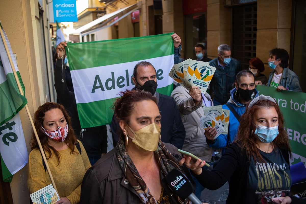 La calle Algarve de Jerez ha sido testigo de esta protesta con la que los transeúntes se topaban al atravesar la estrecha vía. Allí, frente al Punto de Servicio Endesa la Asamblea de Adelante repartía folletos que reivindican una “energía para todos” mientras entonaban sus lemas. Al grito de “ni gente sin luz, ni casa sin gente” o “energía pública”, la formación se ha reunido para deja claro que “encender un ventilador, un climatizador o un calefactor es un derecho humano”.