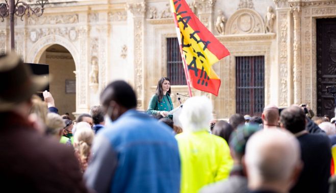 En cuanto al acto en el que intervino el domingo 28F en la Plaza de San Francisco de Sevilla, bajo el lema El fracaso de las autonomías frente a la pandemia, Olona ha querido dejar claro que se mantuvieron todas las medidas sanitarias y se controló que hubiera distancia de seguridad entre los asistentes y que todos llevaran la mascarilla puesta. Ha apuntado que en ningún momento se superó el aforo que marcó la Delegación del Gobierno en Andalucía. Ha indicado que, por ejemplo, en Cataluña se permitió que ciudadanos contagiados salieran de sus casas para acudir a votar y ejercieran el derecho al voto, algo que no se permitió en los comicios en el País Vasco y en Galicia. Olona ha señalado que fue un honor estar en Sevilla y proclamar "alto y claro que hay una alternativa y que no es necesario se autonomista para sentirse andalucista".