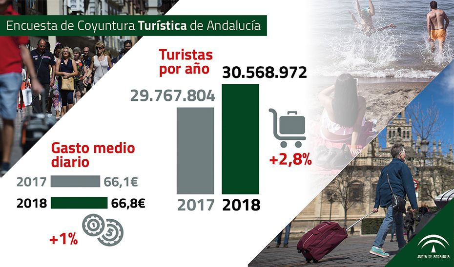 30 millones y medio de turistas visitaron Andalucía durante el pasado año 2018, lo que supone un aumento de un 2,8% con respecto a 2017. El dato forma parte de la Encuesta de Coyuntura Turística de Andalucía, que elabora el Instituto de Estadística de Andalucía. En cuanto a la procedencia, el 31,9% de los turistas que visitaron Andalucía eran andaluces, el 28,5% eran del resto de España, el 28,8% procedían de la Unión Europea y el 10,8% del resto del mundo.