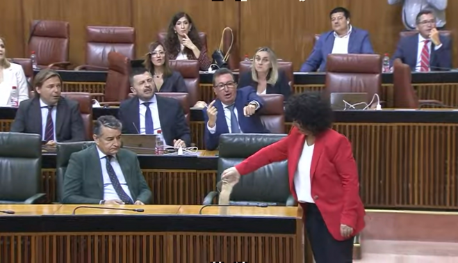 En el turno de palabra de la diputada de Adelante, Maribel Mora ha querido ejemplificar el futuro del Parque Nacional de Doñana tirando un tarro de arena en el escaño de Juanma Moreno, presidente de la Junta de Andalucía, ausente en el debate.