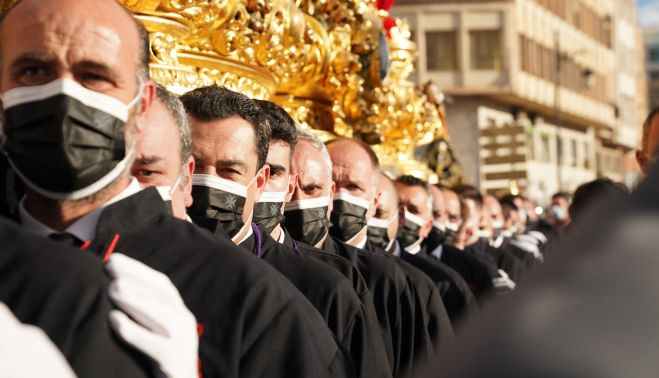 El presidente de la Junta de Andalucía, Juan Manuel Moreno, fue uno de los hombres de trono este Miércoles Santo del Cristo de la Exaltación en Málaga. Lejos de hacerlo de forma discreta e íntima, Moreno lo pregonó hasta el punto de que su equipo distribuyó fotos de él en plena estación de penitencia.