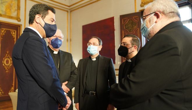 El presidente de la Junta de Andalucía, Juan Manuel Moreno, ha recibido este martes en San Telmo, sede del Gobierno autonómico, al arzobispo de la Diócesis de Sevilla, José Ángel Saiz Meneses, dentro de la ronda de contactos que está llevando a cabo el prelado hispalense desde su toma de posesión, que se oficializó este sábado en la Catedral.