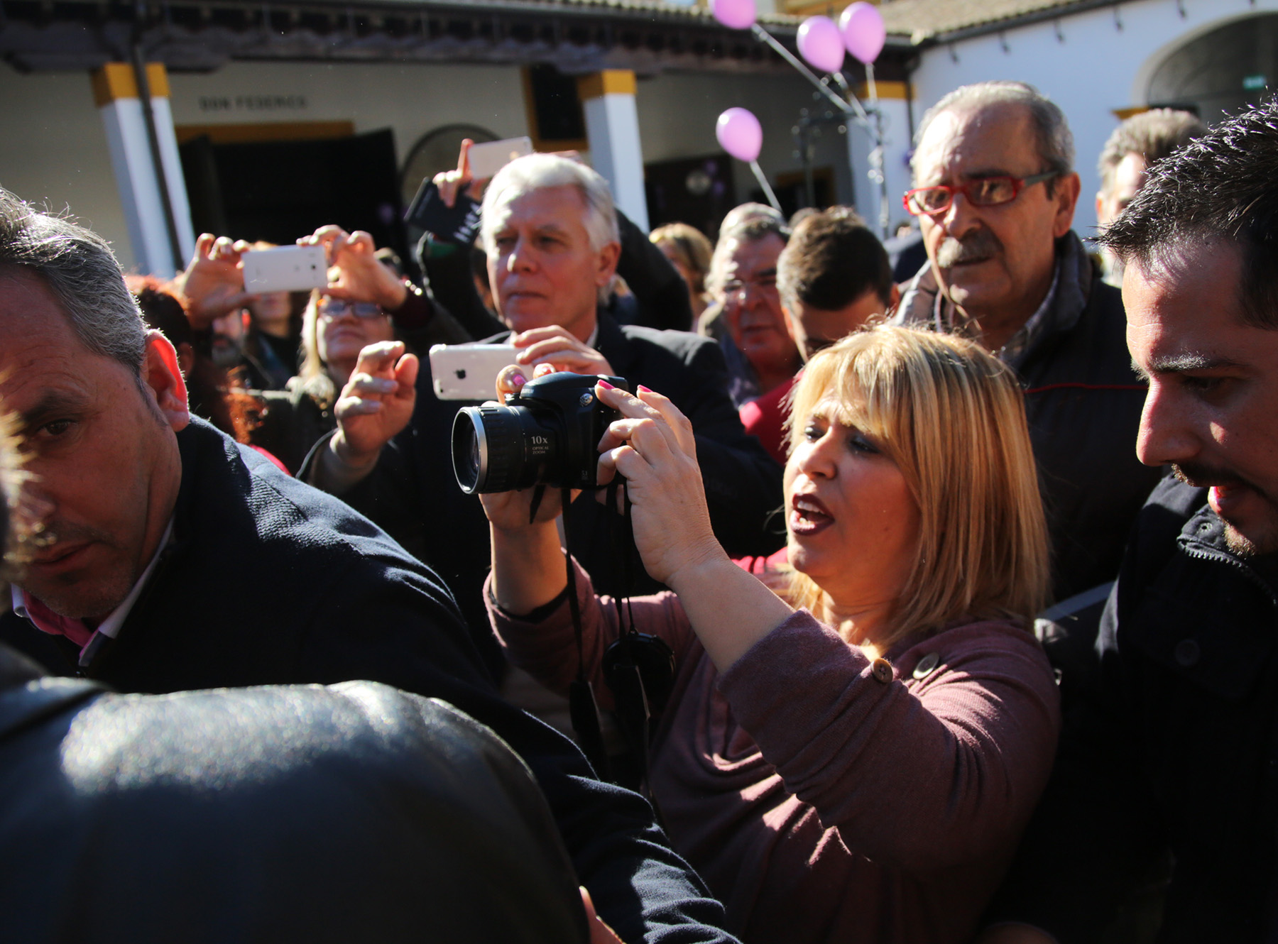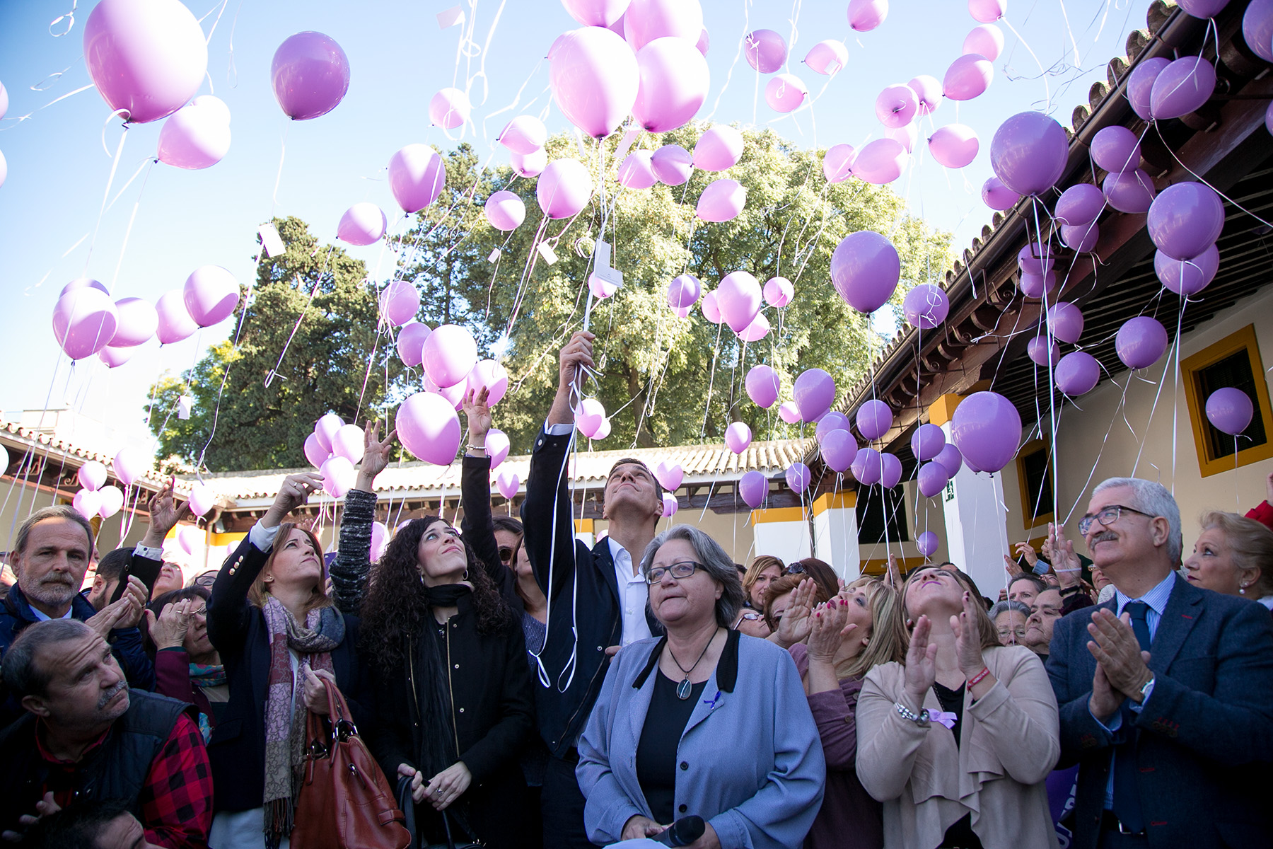 La carrera a la Moncloa también tiene parada en Jerez. En la Atalaya. En el Museo del Tiempo. Qué poético todo. Y cómo lo impregna todo el morado. Algún maledicente alude al color de Podemos ante tanto globo violeta. Es el 25 de noviembre, el Día contra la Violencia de Género. Vale, entonces se justifica. “Es lo que toca”. Y Pdr Snchz, Pedro el guapo, il bello, según la prensa italiana, el político que dice que tiene que reír más, el objetivo de todos los móviles allí presentes, se dispone a darse un nuevo baño de masas. Es miércoles, día laborable en la capital europea del paro. Y hasta allí han llegado los figurantes, los clásicos meritorios del partido a nivel local y provincial, asesores, jefes de todo pelaje, los cargos intermedios y los altos cargos, los ‘mascas’. Todos arropando al “jefe supremo”. “Estamos contigo”, “presidente”, “guapo, guapoooo”, “Pedro, mira aquí…”, “espera, un selfie, Pedrooooo…”, vociferan. En la puerta hay un solitario ex trabajador de Delphi que dice sentirse “traicionado” por “estos ladrones”. Una mujer camina calle Lealas arriba y le pregunta: “¿Qué hay aquí?” Replica: “Estos son los chorizos”. Le mira, nos mira y se justifica: “Desde 2007 llevamos arrastrando esta desgracia, nos dejaron tirados, haciendo cursos que no han servido para nada”. Luego, gritará desde la calle. Su queja a viva voz llegará al oído de uno de los seguratas del evento y, raudo, ordenará a través del pinganillo: “Cerrad ya esa puerta, coño”.