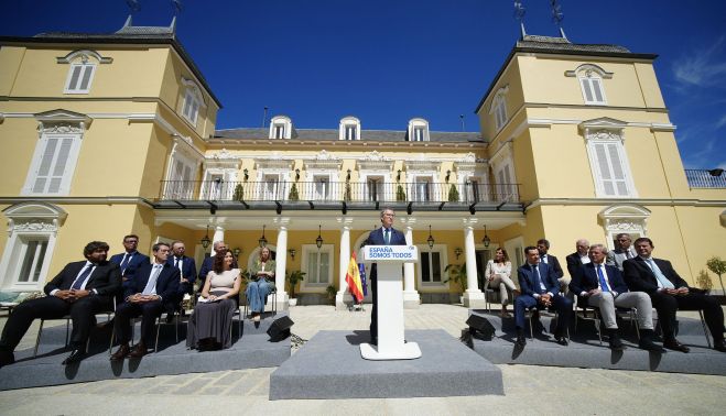 "Nos comprometemos a que lo que es de todos se dialogue y acuerde entre todos", ha dicho el gallego, que ha vuelto a reclamar la Conferencia de Presidentes, que no se convoca desde hace dos años y medio. De hecho, la cierta institucionalidad del encuentro, en un palacio madrileño, venía a significar una conferencia de presidentes paralela. Y si importantes son las formas, no hay que obviar la disposición en la presentación ante la empresa. Feijóo ha hablado desde un pequeño atril con el poder autonómico popular a sus lados. Y en primera fila, los más cercanos, a su derecha, Ayuso; y a su izquierda, Moreno. Son los grandes barones, la madrileña y el andaluz, y el PP no lo esconde.