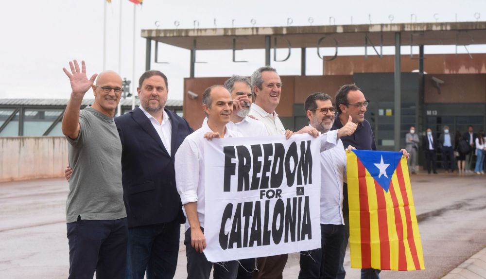 El líder de ERC, Oriol Junqueras; los exconsellers Quim Forn, Josep Rull, Jordi Turull y Raül Romeva; el presidente de Òmnium Cultural, Jordi Cuixart; y el secretario general de Junts, Jordi Sànchez, han salido de la cárcel de Lledoners (Barcelona) este miércoles a las 12.06 horas, tras haber quedado en libertad al recibir el indulto del Gobierno. Apenas 24 horas después de que el Consejo de Ministros aprobara indultarles, los siete presos del 1-O en Lledoners han salido juntos de la prisión con una pancarta en la que se podía leer 'Freedom for Catalonia' (Libertad para Catalunya), y con una bandera 'estelada' y han caminado hacia la salida de la cárcel donde les esperan cerca de un centenar de personas en la entrada.