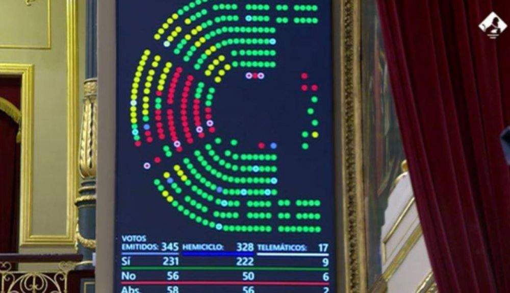 En total, han sido 231 votos a favor (PSOE, PP, PNV, Cs, Coalición Canaria, Navarra Suma, Foro Asturias, PRC, Teruel Existe o PdeCat), por 56 en contra (Unidas Podemos, ERC, CUP, BNG, Junts y EH Bildu) y 58 abstenciones (Vox, Más País y Compromís).