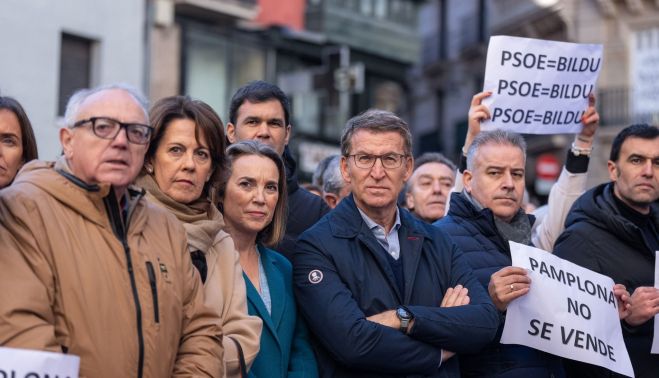 A la concentración ha asistido el presidente del Partido Popular, Alberto Núñez Feijóo, quien, en declaraciones a los medios de comunicación, ha afirmado que la moción de censura en el Ayuntamiento de Pamplona es "la primera factura" del "pacto encapuchado" entre PSOE y EH Bildu y representa también "la última mentira" del presidente Pedro Sánchez.