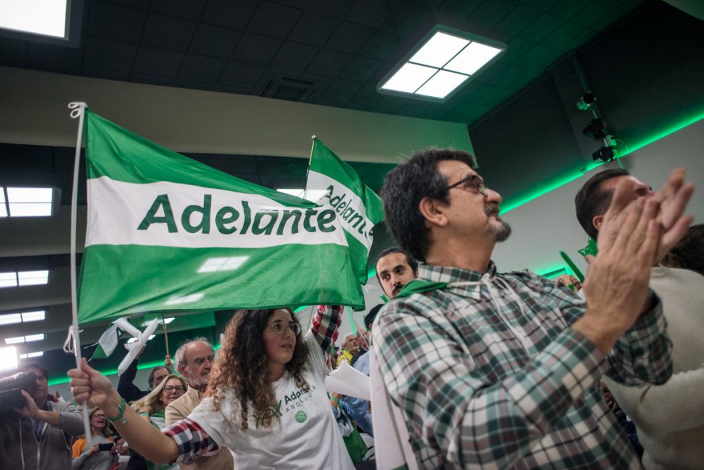 La bandera andaluza, protagonista en Adelante Andalucía. FOTO: MANU GARCÍA."El Partido Andalucista y ese andalucismo potente de antes, a medida que fue perdiendo fuerzas, y de no verse como una herramienta nacional, dejó de tener presencia en el Congreso y en el Parlamento Andaluz para volverse municipalista", explica. "Cada vez en municipios más pequeños, que fue el problema de los últimos tiempos del PA, para ser muleta del PP o del PSOE dependiendo del municipio", critica.