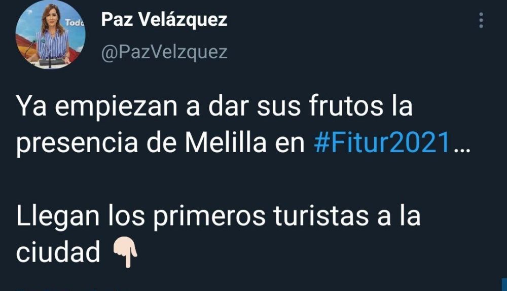 La diputada del PP de Melilla Paz Velázquez ha borrado un mensaje en redes sociales en el que bromea con la situación personal de una persona sin hogar. En el mensaje, señala con ironía que "ya empezan a dar sus frutos la presencia de Melilla en Fitur. Llegan los primeros turistas a la ciudad".