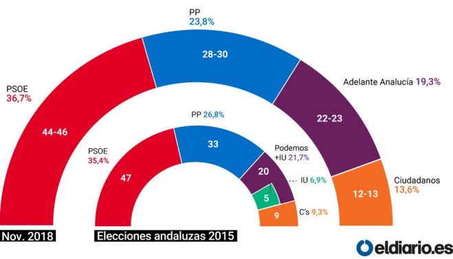 Los datos que arroja la encuesta de eldiario.es publicada anoche se asemeja a las estimaciones y sondeos que se bajaraban por otros medios el pasado mes de octubre aunque con una diferencia importante: el PP no bajaría tanto y Ciudadanos se estancaría. La actual presidenta de la Junta de Andalucía, Susana Díaz, repetiría como ganadora de las elecciones al obtener el 36,7% de los votos, más de un punto porcentual que en las elecciones de marzo de 2015 (35,4%), seguido del Partido Popular que bajaría al 23,8% de los votos, un 3 por ciento menos que hace tres años (26,8%). El PSOE tendría entre 44 y 46 diputados (en 2015 obtuvo 47) y el PP entre 28 y 30 (baja de los 33).