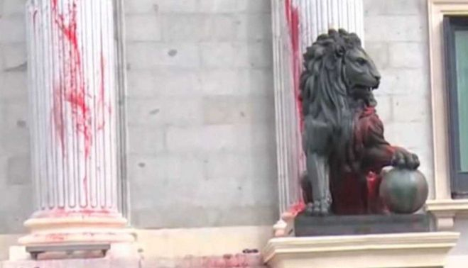 Una decena de activistas ha protagonizado este mediodía una acción sorpresa frente a la fachada de los Leones del Congreso de los Diputados, arrojando botes de pintura roja para protestar por la política climática del Gobierno, aunque han sido detenidos inmediatamente por la Policía.