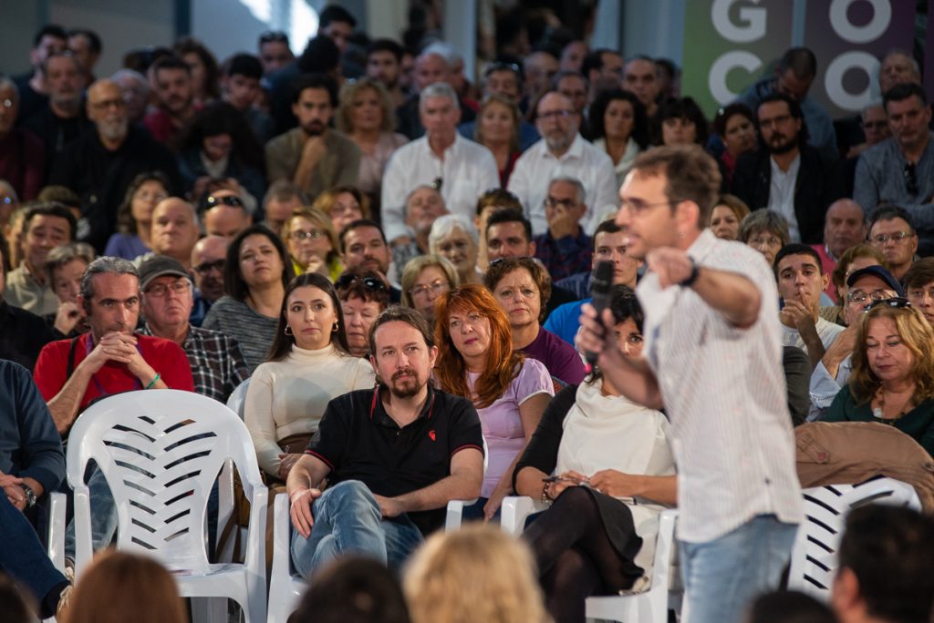 Toni Valero durante el acto de Unidas Podemos en Jerez, bajo la mirada de Pablo Iglesias y Teresa Rodríguez. FOTO: MANU GARCÍA.