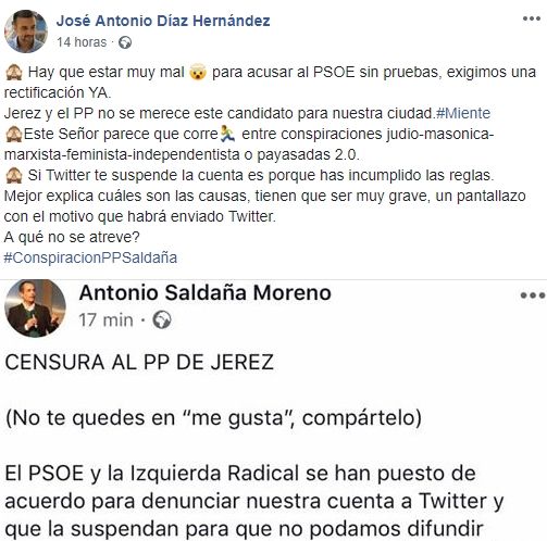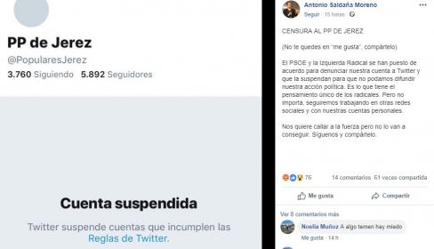 Con 5.892 seguidores, el Partido Popular se ve imposibilitado a la hora de utilizar esta red social, lo que ha provocado la reacción del alcaldable popular Antonio Saldaña a través de otra red social, Facebook. El candidato ha tachado de "censura al PP de Jerez" esta circunstancia y acusa al "PSOE y a la izquierda radical", al haberse puesto "de acuerdo" con objeto de "denunciar nuestra cuenta a Twitter y que la suspendan para que no podamos difundir nuestra acción política". En esa línea, Saldaña incide en que es motivo "del pensamiento único de los radicales". "Pero no importa, seguiremos trabajando en otras redes sociales y con nuestras cuentas personales. Nos quieren callar a la fuerza pero no lo van a conseguir. Síguenos y compártelo", ha apostillado.
