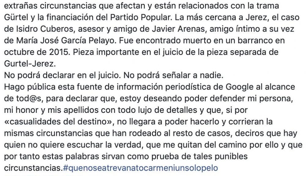 Bajo los hastag #quenoseatrevanatocarmeniunsolopelo y #niaminiamifamilia, mantiene que "hago pública esta fuente de información periodística de Google al alcance de tod@s, para declarar que, estoy deseando poder defender mi persona, mi honor y mis apellidos con todo lujo de detalles y que, si por «casualidades del destino», no llegara a poder hacerlo y corrieran la mismas circunstancias que han rodeado al resto de casos, deciros que hay quien no quiere escuchar la verdad, que me quitan del camino por ello y que por tanto estas palabras sirvan como prueba de tales punibles".