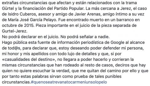 La técnica municipal, para la que Fiscalía solicita siete años de prisión, no está dispuesta a correr la misma suerte de Cuberos. "Son demasiadas muertes relacionadas con una larga lista de fallecidos en extrañas circunstancias que afectan y están relacionados con la trama Gürtel y la financiación del Partido Popular", escribe. Y abunda: "La más cercana a Jerez, el caso de Isidro Cuberos, asesor y amigo de Javier Arenas, amigo íntimo a su vez de María José García Pelayo. Fue encontrado muerto en un barranco en octubre de 2015. Pieza importante en el juicio de la pieza separada de Gurtel-Jerez. No podrá declarar en el juicio. No podrá señalar a nadie".