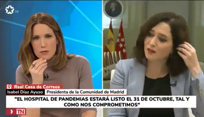 Intxaurrondo preguntó sobre las contrataciones de la Comunidad de Madrid en hospitales que estaba construyendo. Las preguntas incomodaron a la presidenta popular, como se puede ver en el propio vídeo, donde se muestra inquieta al no poder escapar de la falta de nuevas contrataciones. Ayuso no supo contestar sobre la organización sanitaria y terminó la entrevista afirmando a la periodista que "son preguntas que no se le hacen a un presidente autonómico".