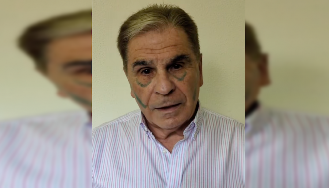 Con la cara pintada de forma exagerada, Ruiz quiere burlarse del maquillaje empleado por Pedro Sánchez, para hacer una serie de revelaciones que ha tenido recientemente.