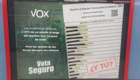 El partido de extrema derecha ha impreso en su cartelería que "los madrileños destinan el 57% de su salario al pago del alquiler, que no para de subir, pero las ayudas se las llevan siempre los mismos".