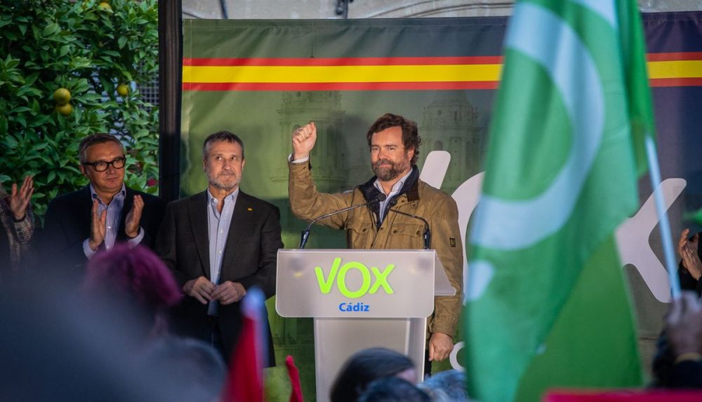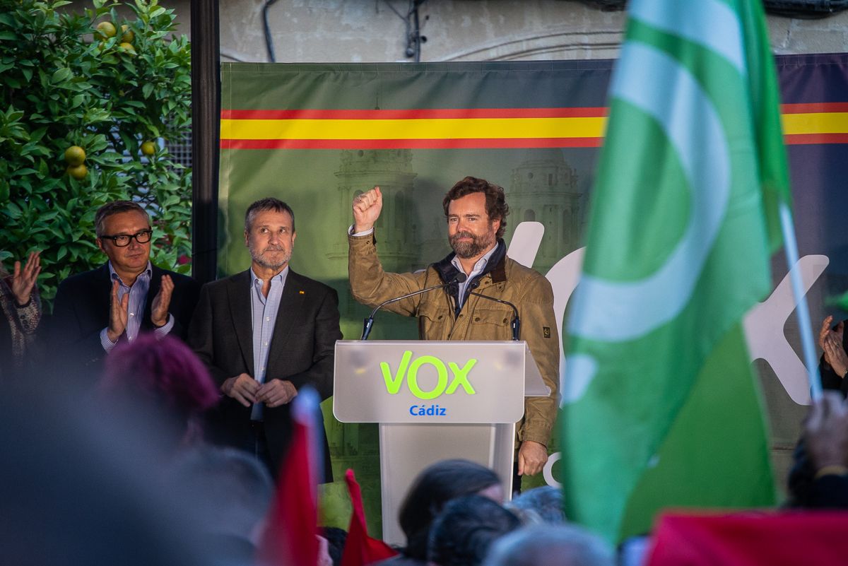 El portavoz del partido de ultraderecha en el Congreso, que lleva un par de días en la provincia, tras su paso por El Puerto, empieza en Jerez alabando el "privilegio" que es vivir en la ciudad, en la provincia, ¡y en España! Más de una docena de veces la nombra a lo largo de un discurso que dura poco más de media hora, provocando incontables "¡viva España!", bastantes "¡arriba España!" —lema franquista— e incluso unos cuantos "¡viva el rey!". Después de pelotear durante unos minutos a Jerez y a toda la provincia de Cádiz, apela al "orgullo" de ser español porque "ganamos batallas navales y terrestres" a ingleses y franceses. Tal cual.