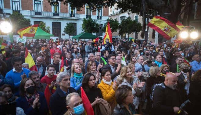 En la plaza, medio llena, hay algunas banderas de España y también verdes de Vox, sobre todo en torno a una carpa con distinto merchandising, como globos o chapas. "Sin miedo a nada ni a nadie", pone en ella. Quedan pocos minutos para que empiece el acto, no oficial, pero sí oficioso de precampaña electoral de las elecciones andaluzas. El Gobierno andaluz no sacará adelante el Presupuesto —casi con toda seguridad— y deberá abrir las urnas. Manuel Gavira, portavoz de la ultraderecha en el Parlamento andaluz, se encarga de demostrar que las elecciones son inminentes cuando interviene en el escenario, lleno de dirigentes o cargos del partido, todos sin mascarilla.