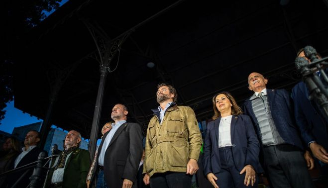 "No me vale con mis buenas intenciones / no me vale con mis buenas acciones / a ella no le vale con que le escriba canciones / ingobernable, el amor de mis amores...", se escucha en la plaza del Banco de Jerez poco antes de las cinco y media de la tarde. Pero C. Tangana se tiene que callar cuando por la esquina se ve llegar a Iván Espinosa de los Monteros, portavoz de Vox en el Congreso, con un numeroso séquito de representantes del partido de ultraderecha en Jerez y la provincia —casi todos hombres— a la plaza del Banco, el centro neurálgico de los actos del partido en la ciudad —ya celebró aquí el 12 de octubre—, muy cerca de la casa natal de Miguel Primo de Rivera.