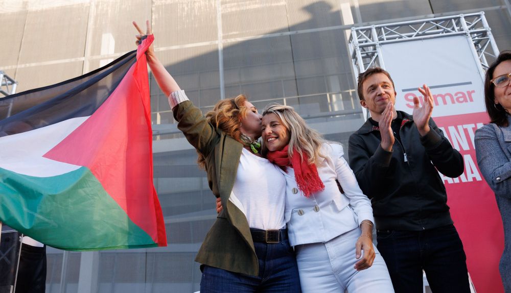En ese sentido, tres temas vertebran claramente el acto: el trabajo, la migración y Palestina, con menciones continuas también a los derechos de las mujeres y las personas LGTBI y a la importancia de los cuidados. Sumar se presenta como el partido que aborda los problemas 'reales' de la gente, y así lo transmiten todos los intervinientes.