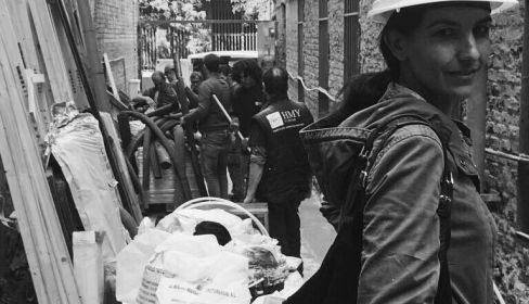 La foto utilizada, precisamente, no era la mejor para hablar de prevención y seguridad porque la única persona que aparecía con casco de obra era ella, la que no estaba trabajando. Mientras, el resto que aparece en la foto, todos obreros, trabajan sin medidas de seguridad apropiadas para minimizar los riesgos.