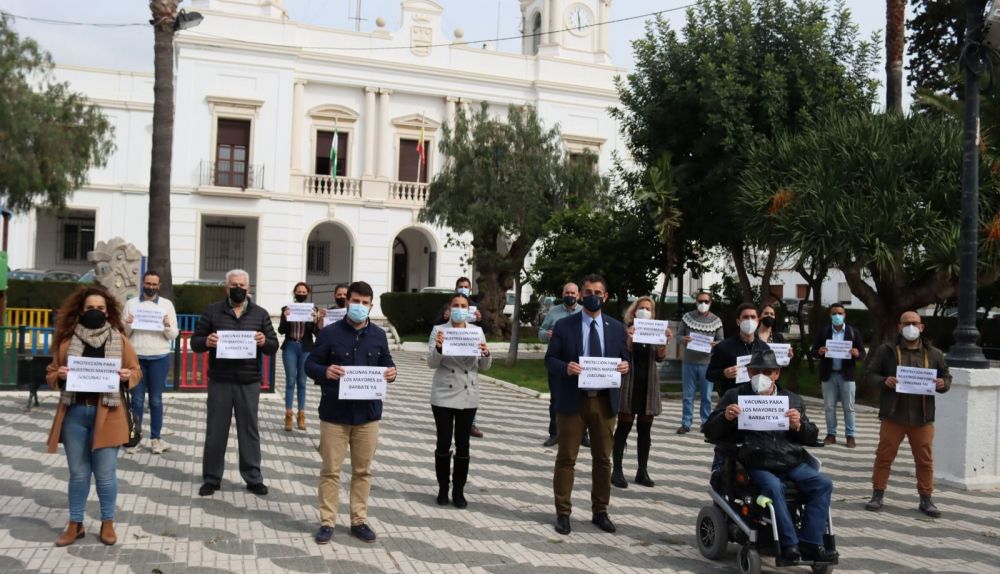 La Corporación municipal del Ayuntamiento de Barbate ha realizado una concentración frente al edificio Consistorial para exigir a las autoridades sanitarias que comience con el proceso de vacunación en la localidad, tal y cómo se viene realizando en el resto de municipios. La concentración ha estado presidida por el alcalde de Barbate, Miguel Molina, junto al resto de equipo de Gobierno, representantes de la ELA Zahara de los Atunes y del grupo municipal socialista.