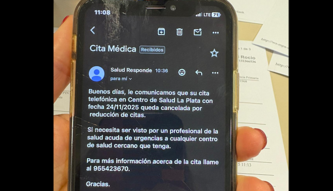 En uno de los mensajes fraudulentos, se puede leer: “Buenos días, le comunicamos que su cita telefónica en centro de salud La Plata con fecha 24/11/2025 queda cancelada por reducción de citas”.