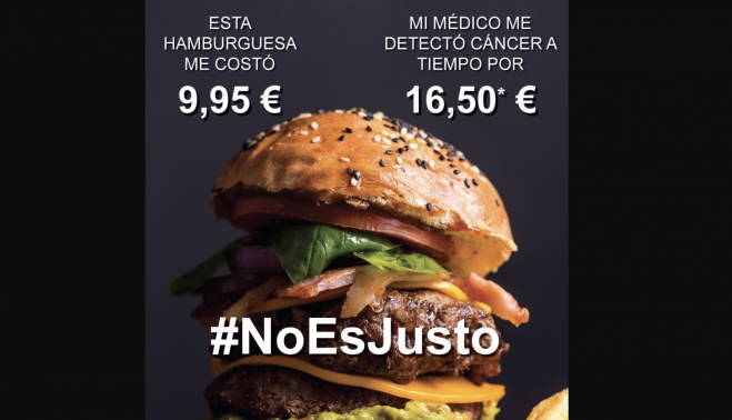 El Colegio de Médicos de Sevilla ha lanzado la campaña '#NoEsJusto' para denunciar los "bajos" honorarios que perciben los facultativos en la sanidad privada. Se trata de una pionera iniciativa que está ya visible a través de una red de cartelería en toda la capital andaluza, buscando una notable repercusión y, sobre todo, la concienciación de la sociedad sobre los "ínfimos" emolumentos que reciben los médicos. En uno de los carteles, se ve una hamburguesa que cuesta 9,95 euros frente a la detección de un cáncer, que apenas supone un desembolso de 16,5 euros.