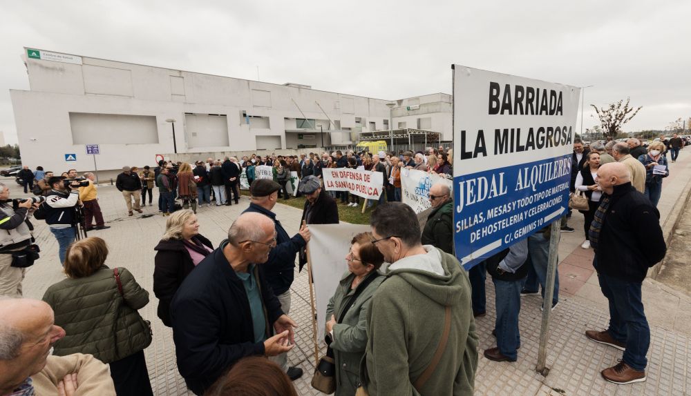 “Fuera listas de espera”, “no nos mires, únete”. Las voces de decenas de vecinos han retumbado este martes frente al centro de salud de La Milagrosa, en Jerez. El cielo está gris, como la sanidad pública, en cuya defensa sindicatos, asociaciones vecinales como Solidaridad, Marea Blanca y otros colectivos se han unido. Según los datos que el Ministerio de Sanidad sacó a la luz recientemente, más del 12% de la población andaluza está en lista de espera, 1.034.292 personas. A junio de este año, 20.000 pacientes más que hace un año conforman estas listas infinitas que llevan a la comunidad autónoma a tener la segunda tasa más alta de España.