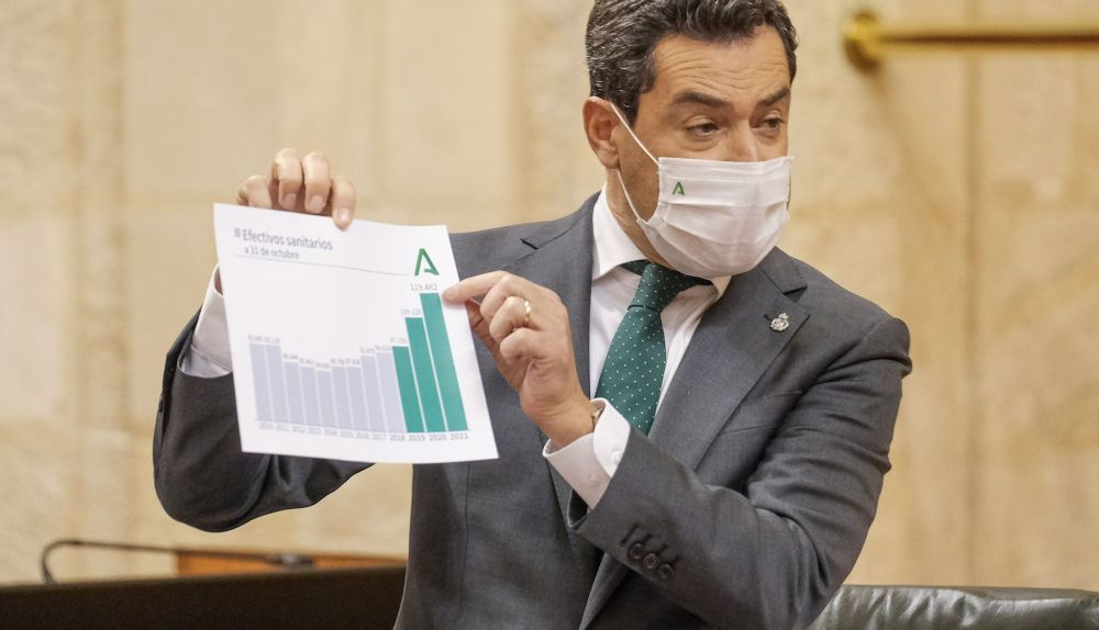 El sistema sanitario público andaluz está "absolutamente tensionado porque tenemos un pedazo de pandemia", ha dicho este miércoles el presidente de la Junta, Juan Manuel Moreno Bonilla, en el Parlamento. En un pleno en el que el estado actual de la Sanidad de la comunidad ha estado sobre la mesa, Moreno Bonilla ha justificado su gestión señalando que "esta crisis supera la capacidad de las comunidades", culpando al Gobierno central, que aunque "no tenga las competencias en Sanidad, sí tiene capacidad de planificación, organización e impulso".