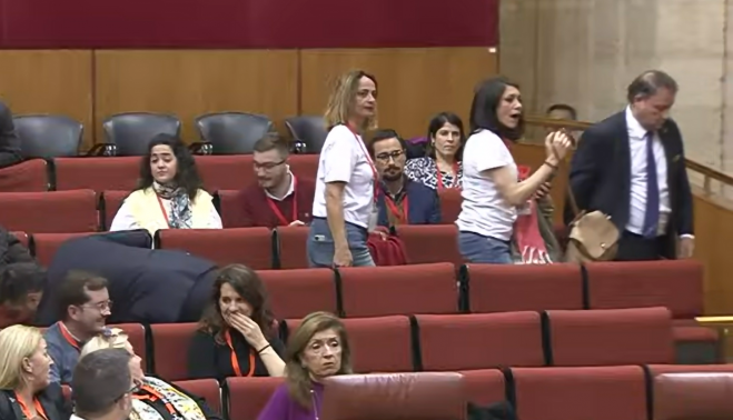 Los hechos han tenido lugar tras la comparecencia de la consejera de Salud de la Junta de Andalucía, Catalina García. Una vez finalizada su segunda intervención, dos técnicas en cuidados auxiliares de enfermería (TCAE) han gritado dentro del salón de plenos para pedir una sanidad pública, "¡no a la privatización!". Todo ello mientras la consejera regresaba a su escaño.