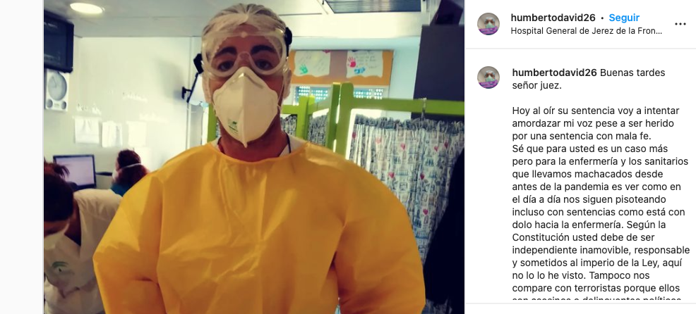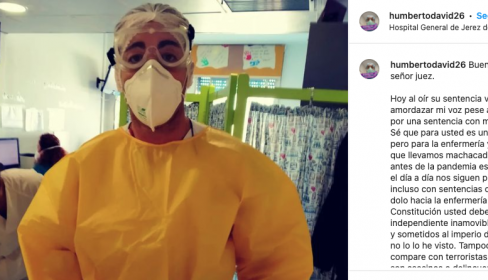 "Hoy al oír su sentencia voy a intentar amordazar mi voz pese a ser herido por una sentencia con mala fe", escribe en sus redes sociales Humberto Otero, enfermero en el Hospital de Jerez, en respuesta al juez jienense que ha considerado en una sentencia que los sanitarios tenían la "obligación de sacrificar su derecho a la vida e integridad", aun sin mascarillas, durante la primera ola de la pandemia, en beneficio de la vida e integridad del resto de la población.