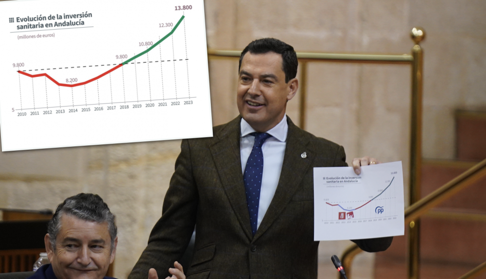 Moreno, entonces al frente de la oposición del PP a la hegemonía socialista en la Junta y que llamaba a Susana Díaz la presidenta "del no", recordaba entonces que la inversión de 2014 en materia sanitaria se retrotraía a niveles de 2002. Un año y unas cuentas en las que el gasto sanitario tocó especialmente fondo en la comunidad.
