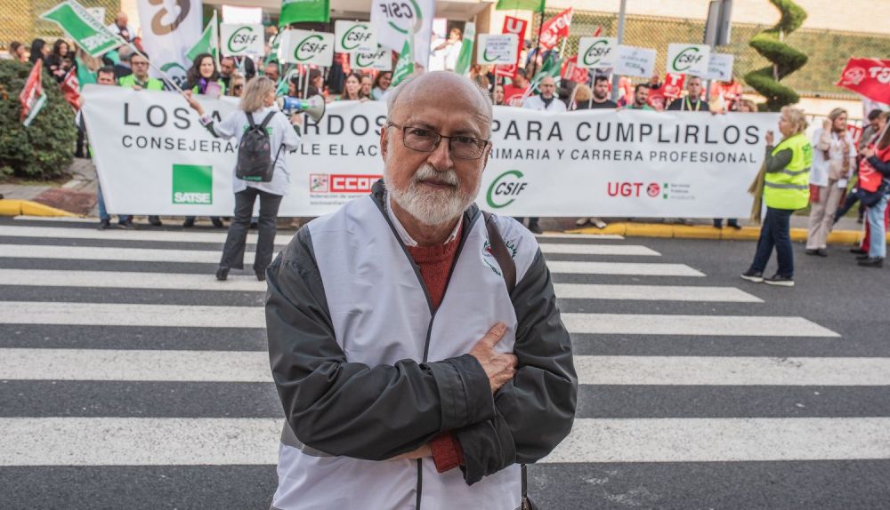 Sebastián Martín Recio (El Rubio, 1953) fue alcalde de Carmona por Izquierda Unida entre 1995 y 2007. Con trayectoria en su partido, coordinador en la provincia, y un peso pesado en Andalucía. Hoy, este médico jubilado, es el coordinador de las Mareas Blancas de Andalucía, y ha participado en el encierro organizado desde la mañana de este jueves en el Hospital Virgen del Rocío. Hoy, paciente, y hasta hace poco, sanitario, "médico de familia en Carmona durante 33 años".