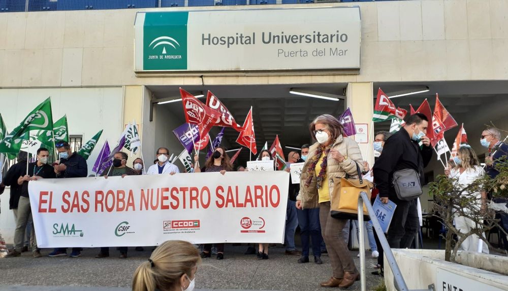 CCOO, SMA, CSIF y UGT se concentran contra el "robo" del complemento de productividad a los profesionales del SAS. Los cuatro sindicatos de Mesa Sectorial se unen ante una situación sin precedentes y que provoca hartazgo entre los profesionales. El sindicato provincial de Sanidad de CCOO de Cádiz denuncia la actitud cicatera del Servicio Andaluz de Salud con sus 100.000 trabajadores a los que les debe parte del salario que tenía que pagar en el 2020 correspondiente a la productividad de su trabajo, y que se niegan a darles, obligando a los trabajadores a tener que poner miles de demandas judiciales para cobrar lo que les corresponde y se han ganado con su trabajo y esfuerzo.