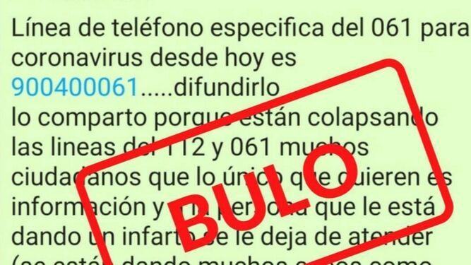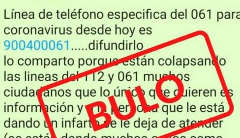 "Línea de teléfono especifica del 061 para coronavirus desde hoy es 900 400 061. Difundidlo. Lo comparto porque están colapsando las lineas del 112 y 061 muchos ciudadanos que lo único que quieren es información y a la persona que le está dando un infarto se le deja de atender (se están dando muchos casos como este ejemplo). Es muy importante la difusión de este nuevo número específico para casos de coronavirus. Compartid en vuestros grupos, por favor". El mensaje, difundido por redes sociales, sobre todo por WhatsApp, circuló hace unos meses, aunque está volviendo a compartirse. Emergencias 112 ya avisó de que es falso.
