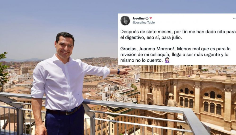 Su indignación por esta larga demora la ha expresado en redes sociales. "Gracias, Juanma Moreno. Menos mal que es para la revisión de mi celiaquía, llega a ser más urgente y lo mismo no lo cuento".