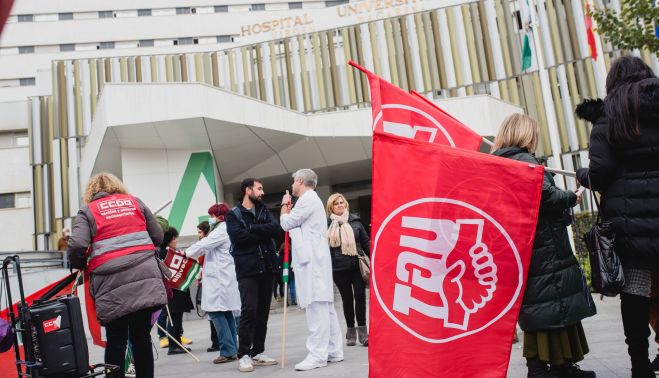 Tanto CCOO como UGT se han concentrado este jueves a las puertas de varios hospitales andaluces para exigir a la Consejería de Salud medidas contra el colapso que sufren las urgencias de toda Andalucía. La afluencia, debido a la situación y al horario en el que se producían las protestas, no ha sido masiva, pero los sindicatos han dejado claro que seguirán dando batalla.