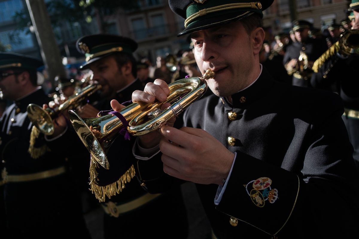 Detalle de la Banda de Cornetas y Tambores de la Centuria Romana Macarena de Sevilla detrás del Cristo de la Defensión. FOTO: MANU GARCÍA.