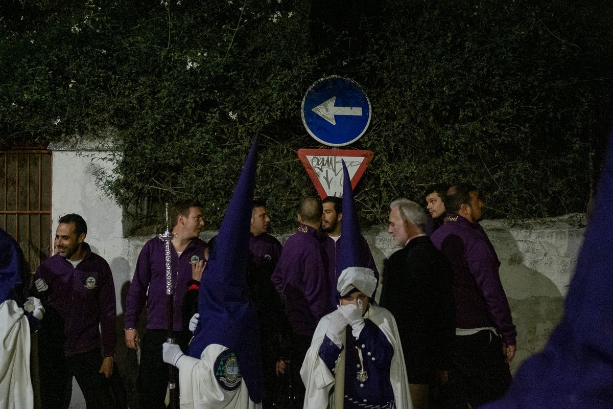 Un joven penitente y un grupo de costaleros esperando a ver cómo baja el Cristo de la Salud camino de su parroquia. FOTO: MANU GARCÍA.