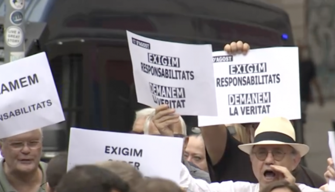 Durante el acto, unas 40 personas se han concentrado en las inmediaciones de La Rambla con carteles de "Reclamamos responsabilidades" y "queremos saber la verdad", y han abucheado a las autoridades en distintos momentos de la ceremonia.